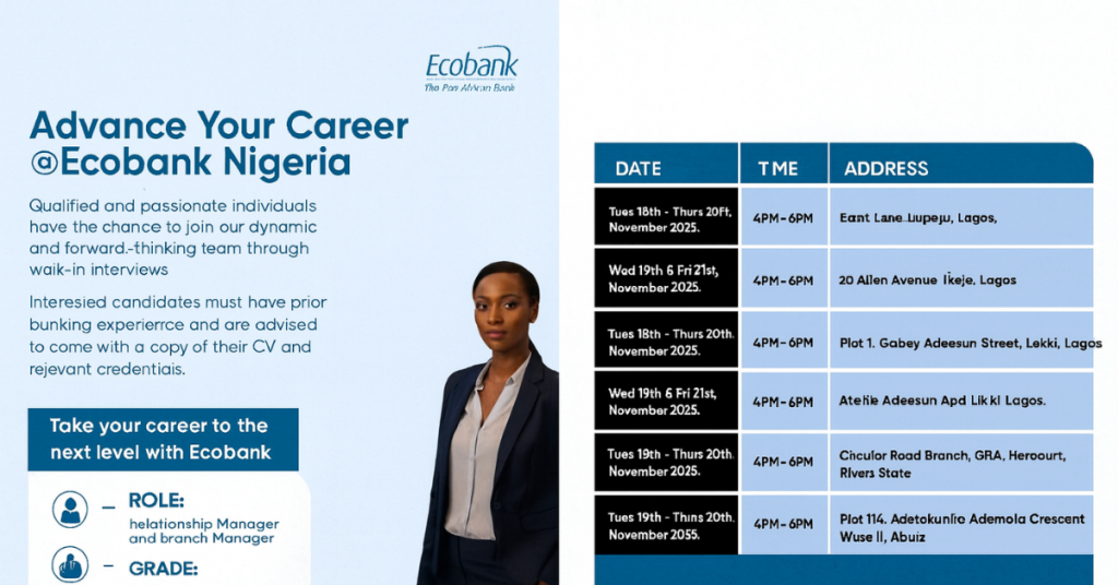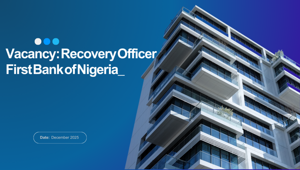 💼 Vacancy: Recovery Officer — First Bank of Nigeria 📍 Locations: Lagos | South | North | East 💰 Compensation: ₦350,000 – ₦500,000 Monthly 🏢 Office Address: Samuel Asabia House, Lagos About the Role First Bank of Nigeria revered as the cornerstone of modern banking in West Africa — is seeking experienced Recovery Officers to fortify its credit risk and debt management divisions across key regions in the country. With more than a century of sustained excellence, First Bank remains a pillar of stability and trust, offering employees a culture that values professional growth, discipline, and innovation. As a Recovery Officer, you will be charged with the strategic and operational management of non‑performing loan portfolios. Your expertise will help reduce delinquent accounts, protect secured collateral, and reinforce the Bank’s reputation for integrity, diligence, and financial prudence. The position demands a strong sense of discretion, legal understanding, and a results‑driven approach to revenue recovery in alignment with First Bank’s corporate ethics and governance standards. Key Responsibilities Conduct systematic recovery operations to reduce bad debt and ensure steady cash inflow into the Bank’s credit portfolio. Initiate, monitor, and report frequent recovery drives within assigned territories to target recalcitrant debtors. Engage, train, and supervise contracted recovery agents to ensure goal alignment and adherence to ethics. Provide regular updates to management through monthly and quarterly performance reports. Conduct collateral verification and physical inspection to safeguard secured assets. Oversee foreclosure procedures for defaulting customers and facilitate asset liquidation where legally appropriate. Liaise with law enforcement agencies, courts, and external counsel on cases relating to fraud, trespass, or mortgaged property. Prepare and review repayment plans submitted by clients and advise management on achievability. Collaborate with compliance and legal departments to maintain adherence to current debt regulations. Render timely postings of recoveries into the CAMAC system and maintain accurate account records. […]