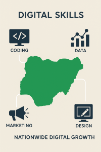 Digital skills in Nigeria refer to the technical and creative abilities that help individuals use technology effectively for work, communication, and innovation. They include areas such as digital marketing, web development, data analysis, UI/UX design, and cybersecurity. These skills are now essential for both employment and entrepreneurship in today’s economy.